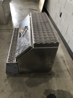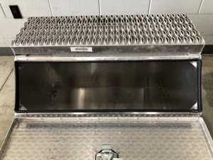 Heavy-duty stainless steel hinge, locking roller style polished stainless steel T-handle latch & commercial-grade one-piece gasket for the closing lid. This box also features a 10-gauge aluminum non-slip grip strut steps